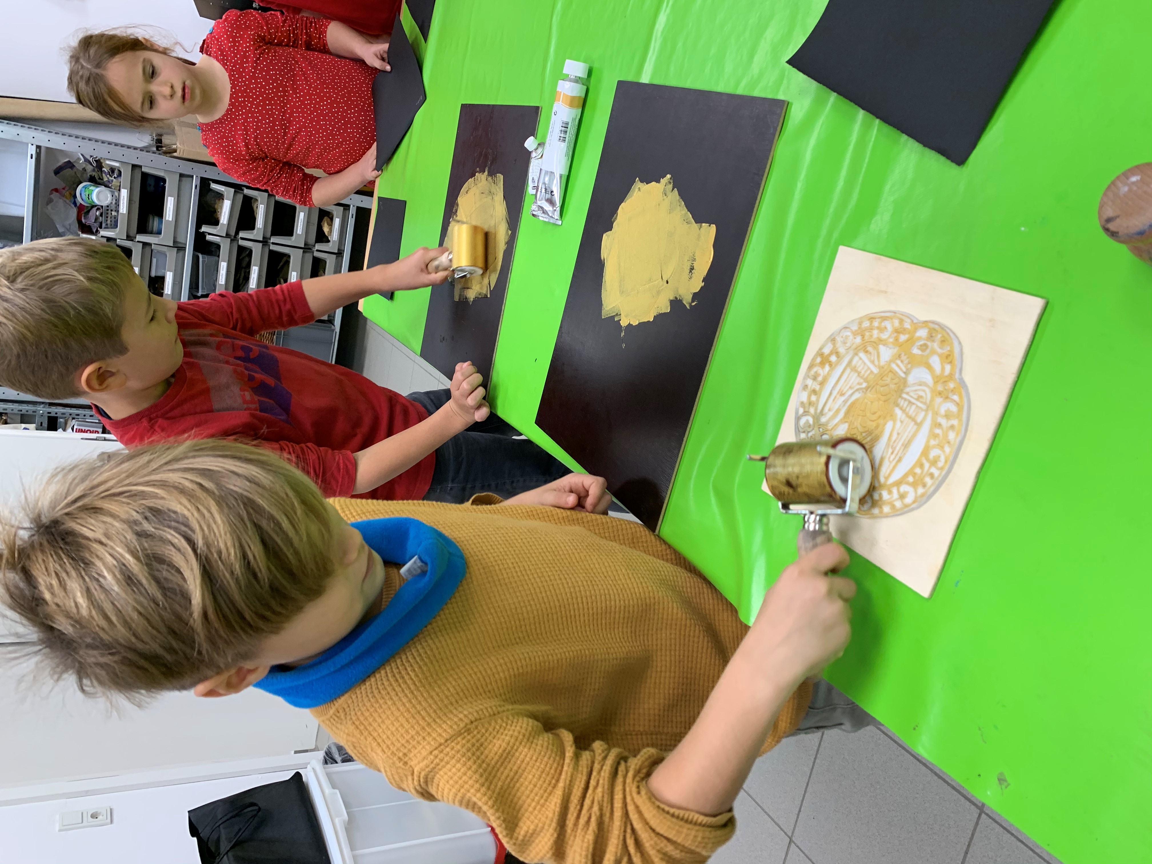 Trotz des engen Raums und den faszinierenden Ausstellungsstücken gelang es unserer Klasse aber tatsächlich, den Alarm nicht auszulösen – ein echtes Highlight für die Kinder. Der nächste Höhepunkt folgte umgehend, als wir gemeinsam in die, dem Museum zugehörige, Werkstatt gingen. Dort konnten die Kinder „Der charismatische Ort Adlerscheibenfibel“ von Kaiserin Agnes (980 – 1000 n.Chr.) drucken und Originalgetreu nachgestalten. Zunächst wurde mit einer Rolle goldene Farbe auf die Druckvorlage aufgetragen, dann das Blatt aufgelegt und mit einer Art Stempel festgedrückt. Nach dem Trocknen wurde das Bild dann noch mit Buntstiften verschönert und stolz mit nach Hause genommen.